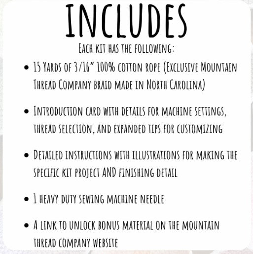 Craft THREE rope bowls to customize as you wish with the Set of Three Bowls DIY Rope Basket Kit from The Mountain Thread Company. The finished baskets are the perfect size to hold a watch & other jewelry, some candies, or crafty bits. Expect some variation, but each basket would measure 4-5” across and 1” tall. Make it even more unique by using up fabric scraps from old projects! This is a sewing machine project. Your sewing machine will need a zigzag stitch and be able to handle sewing something like jeans. 50wt high quality thread is also highly recommended. This is an introductory basket project for sewists who are confident in steps like changing the machine needle, adjusting stitch length and width, and pivoting. This is a Do It Yourself Kit—no finished products are included.