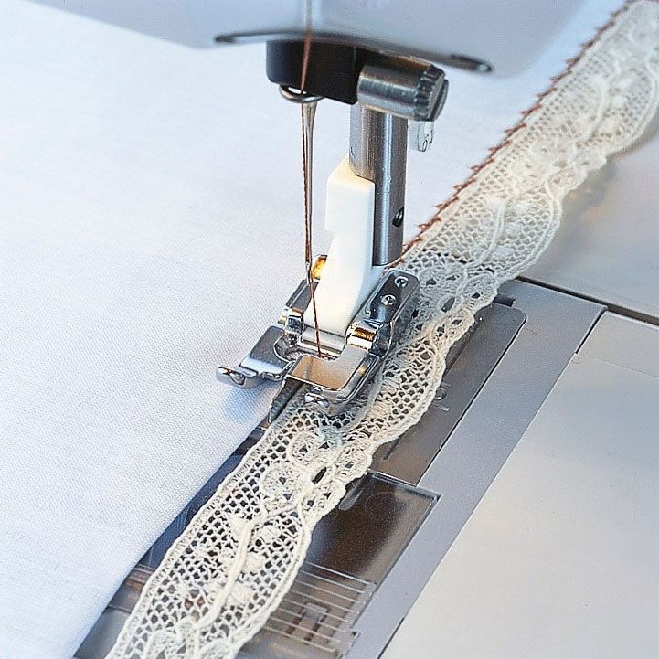 Guides topstitching. Guides trims that are sewn to an edge or when two trims are sewn together. Edge/stitch: Straight stitch, left needle position, length 2–4.