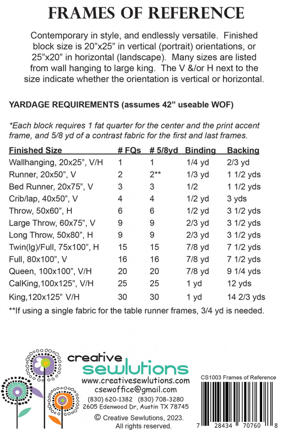 Contemporary in style, and endlessly versatile. Finished block size is 20x25" in vertical orientation, or 25x20" in horizontal, so the size options are plentiful.