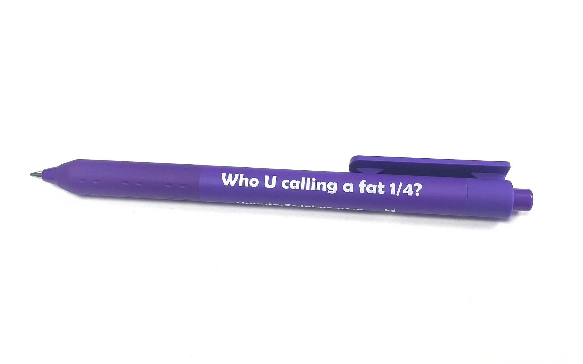 This fun gel pen features a quilting pun - "Who U calling a fat 1/4?" as well as the Country Stitches logo and phone number. It writes beautifully with purple or turquoise ink.