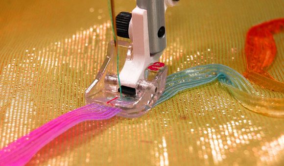 - Use light weight “flat” ribbons, for example, organza (ribbons with coarse texture will not feed smoothly through the foot).