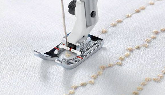 Sew beautiful heirloom candlewicking techniques! The foot has a deep tunnel on the underside to feed over built-up stitching.