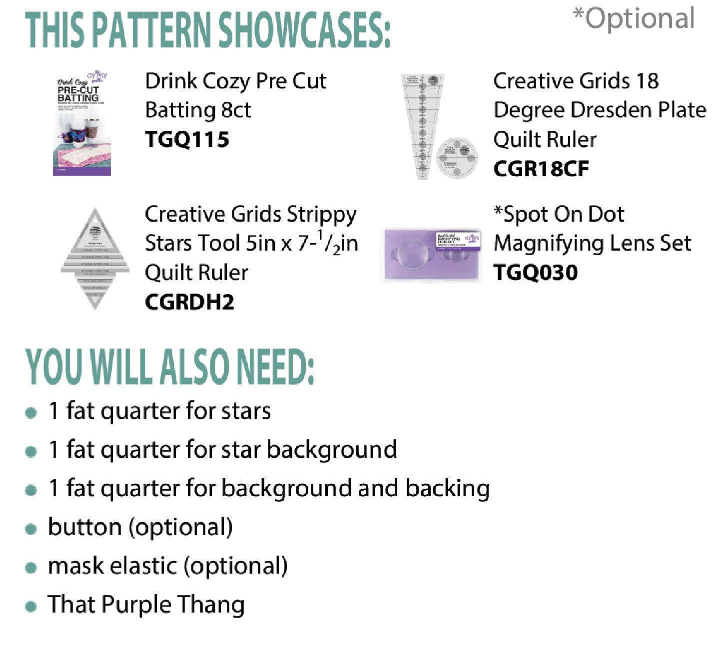 - The Starry Drink Cozy uses three coordinating fat quarters and a couple of Creative Grids rulers to create this fun accessory. Need a quick, fun gift that can be completed in just a few hours? This is it!